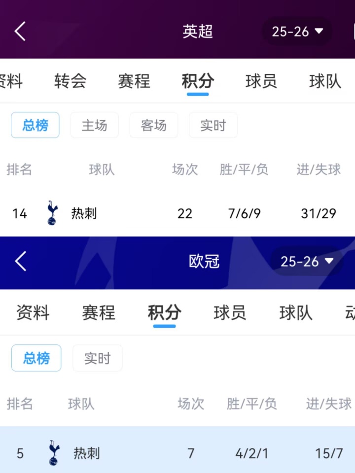 热刺本赛季目前成绩↓